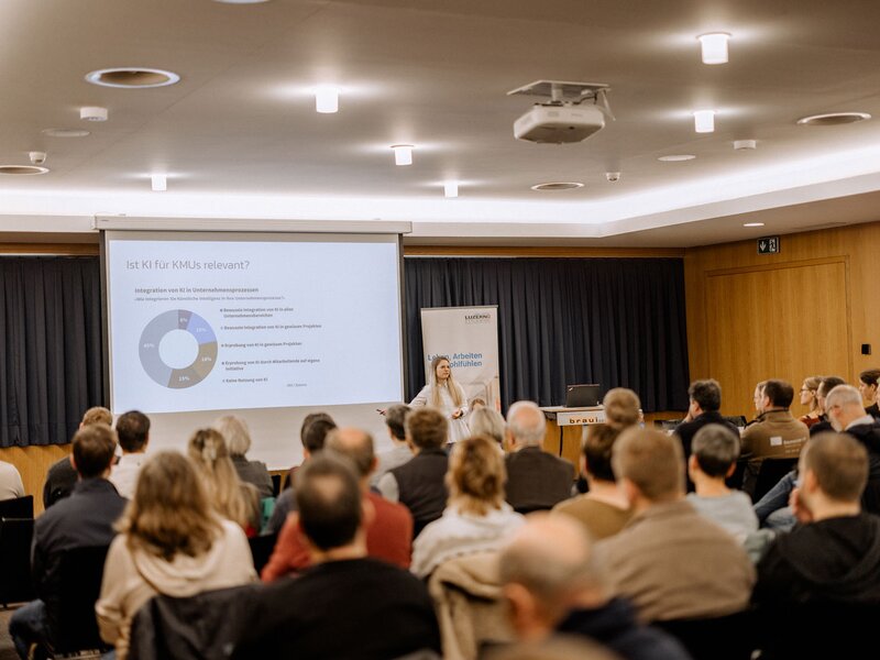In ihrem Referat «KI im Alltag von KMUs: Vom Hype zum echten Mehrwert» zeigte Wagner auf, was Künstliche Intelligenz ist, weshalb sie für KMU von Relevanz ist und wie Unternehmen bereits heute niederschwellig davon profitieren können. Sie demonstrierte eine konkrete Einsatzmöglichkeit – die automatisierte Kategorisierung von Emails. Zudem beleuchtete sie Vorteile wie Effizienzsteigerungen und Kostenersparnisse, aber auch Herausforderungen wie Datenschutz, fehlende Ressourcen oder die Auswahl passender Tools.