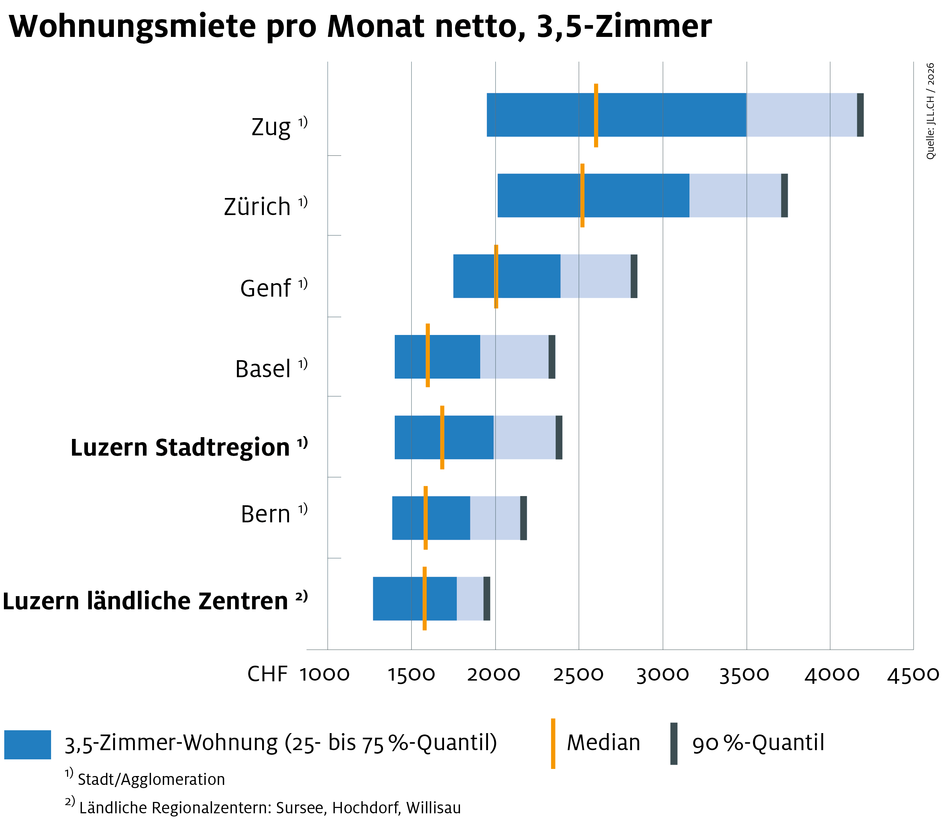 Die Mietpreise für Büroflächen im Kanton Luzern sind attraktiver als in Basel, Genf, Lausanne, Zürich oder Zug. Entlang der Hauptverkehrsachsen Luzern–Zug–Zürich sowie Luzern–Basel sind Grundstücke und Büroräumlichkeiten in allen Grössen und mit bester Verkehrsanbindung zu attraktiven Preisen verfügbar.