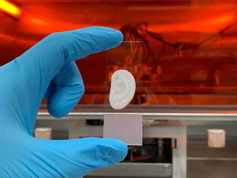 As their starting material, Philipp Fisch and his team extracted cells from small cartilage remnants removed in operations to correct the shape of patients’ ears. These were cultivated in cell cultures to produce sufficient quantities for a base substance. The major challenge here is to promote the formation of type II collagen cells, which are typical of ear cartilage. In addition to the special collagen, the protein elastin must also be produced. This is a protein that gives the ear its flexibility. A mixture of elastin, collagen II and sugar-like glycosaminoglycans was embedded in so-called bioink. This gel-like material was formed into the shape of an ear using a 3D printer and then placed in an incubator to mature for several weeks. «We optimised cell proliferation, adjusted the material properties, increased the cell density and controlled the maturation environment more effectively,» commented Philipp Fisch. The ear constructs were implanted subcutaneously in rats and the material proved to be stable for a period of six weeks.