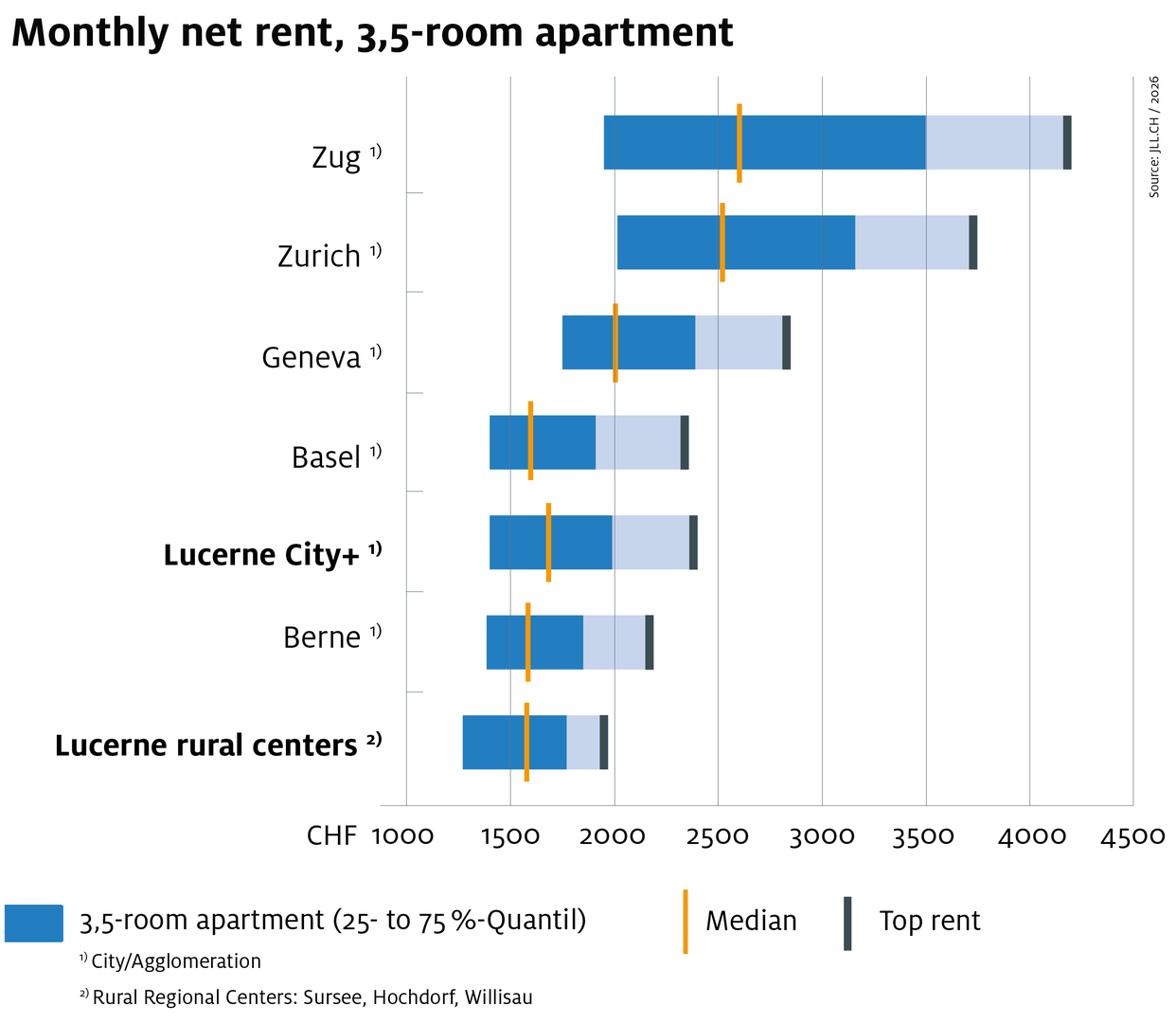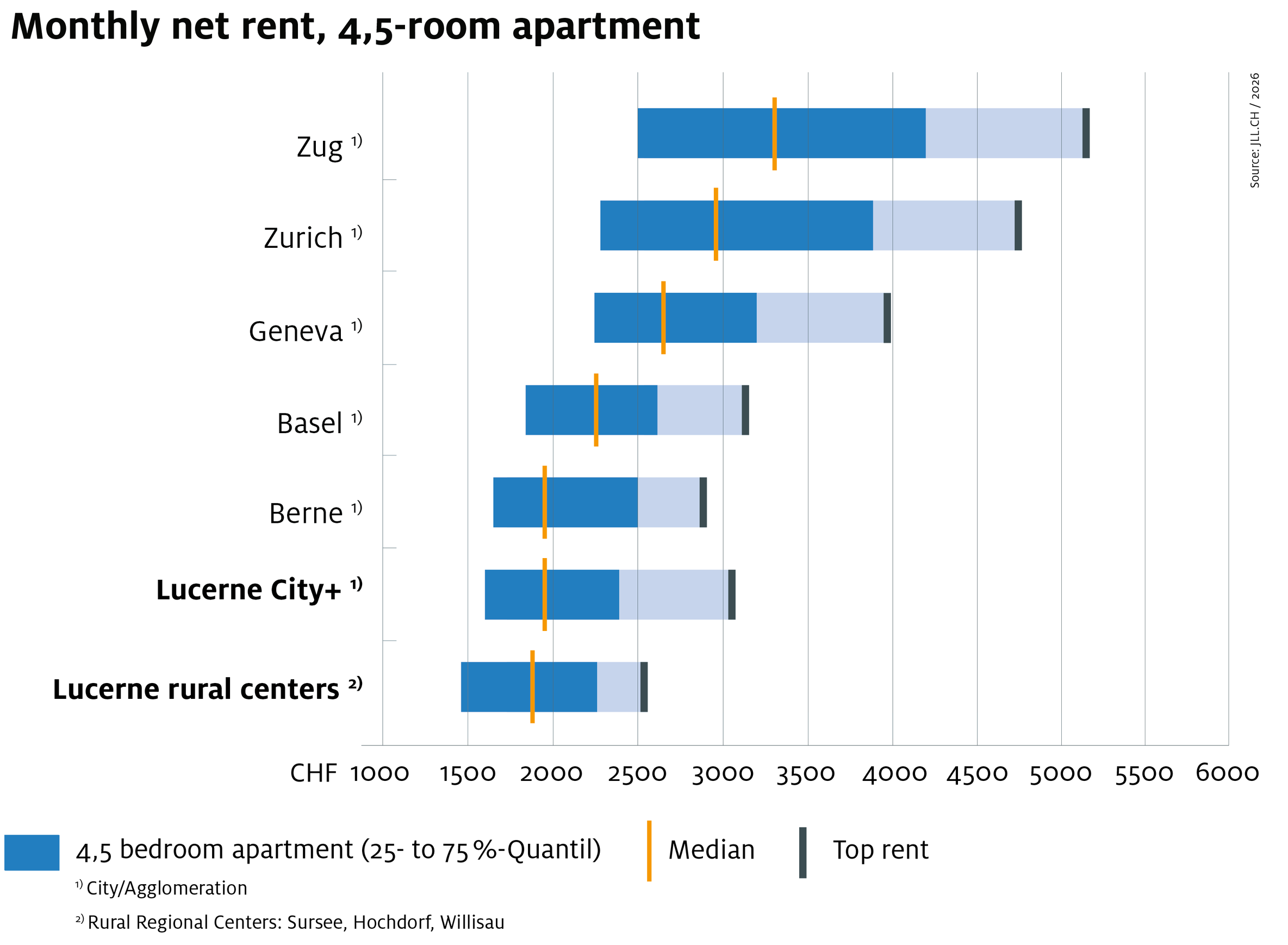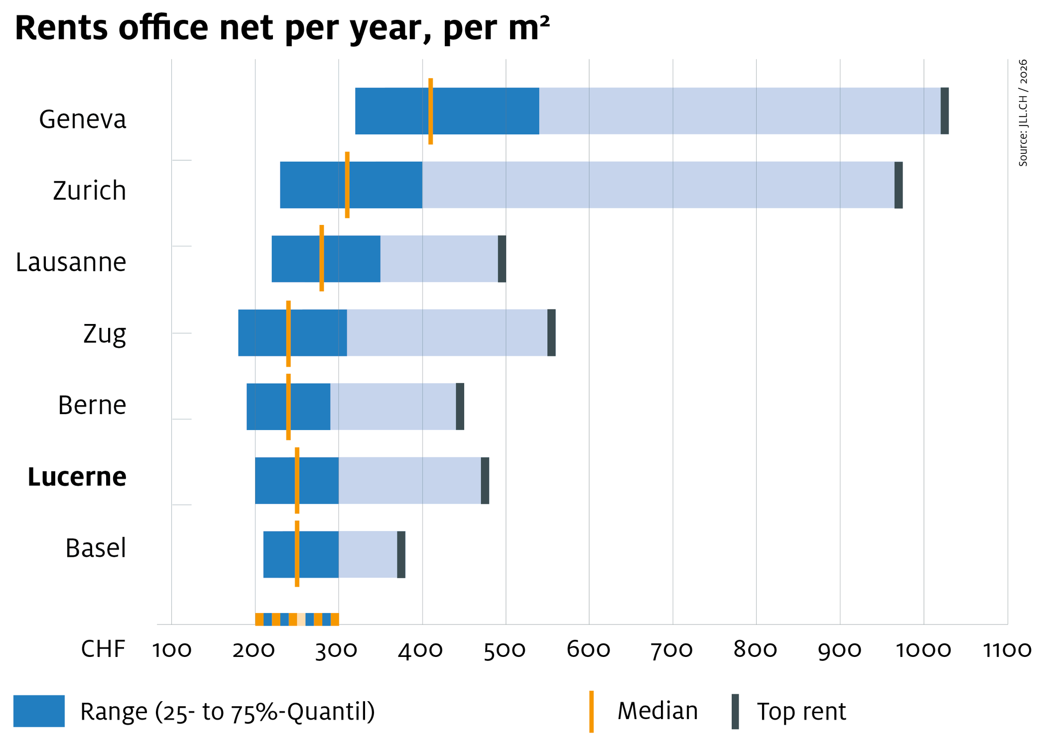 Rental prices for office space in the canton of Lucerne are more attractive than in Basel, Geneva, Lausanne, Zurich or Zug. Along the main transport axes of Lucerne–Zug–Zurich and Lucerne–Basel, construction land and office space of all sizes and with excellent transport links are available at attractive prices.