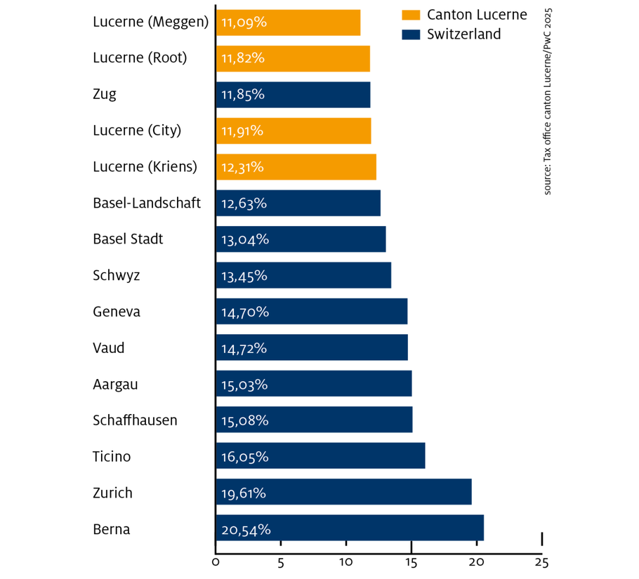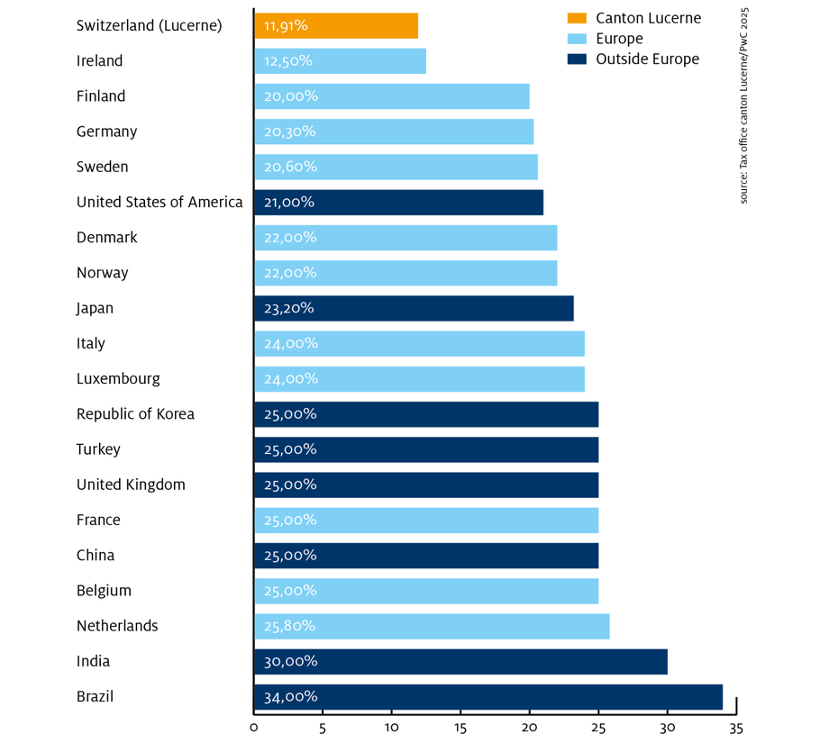 The canton of Lucerne is among the most tax-friendly business locations in Switzerland and also stands out internationally for its low corporate tax burden.